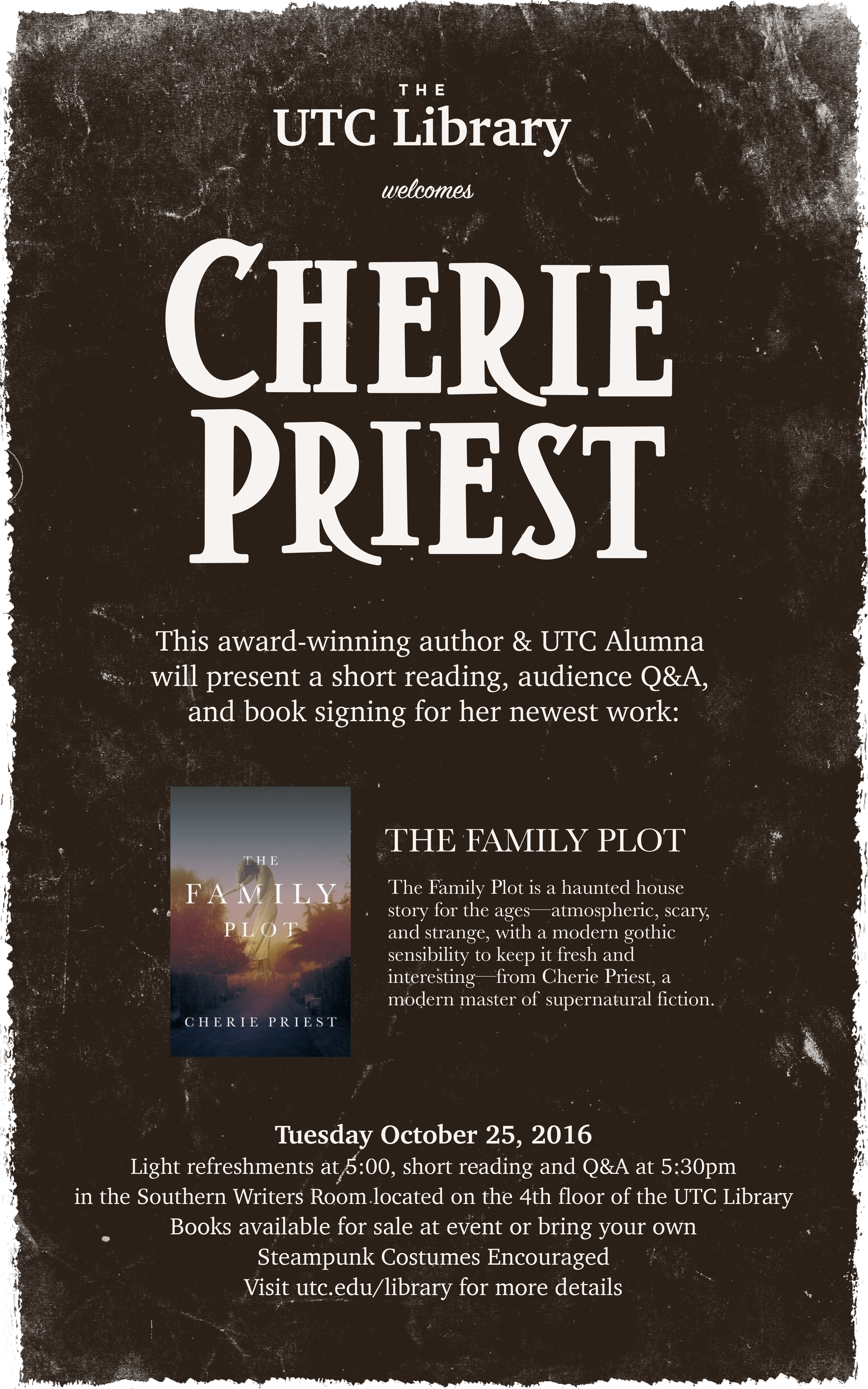 Great news - we're having another author visit in the Library! UTC Alumna and author Cherie Priest will be here to do a reading …